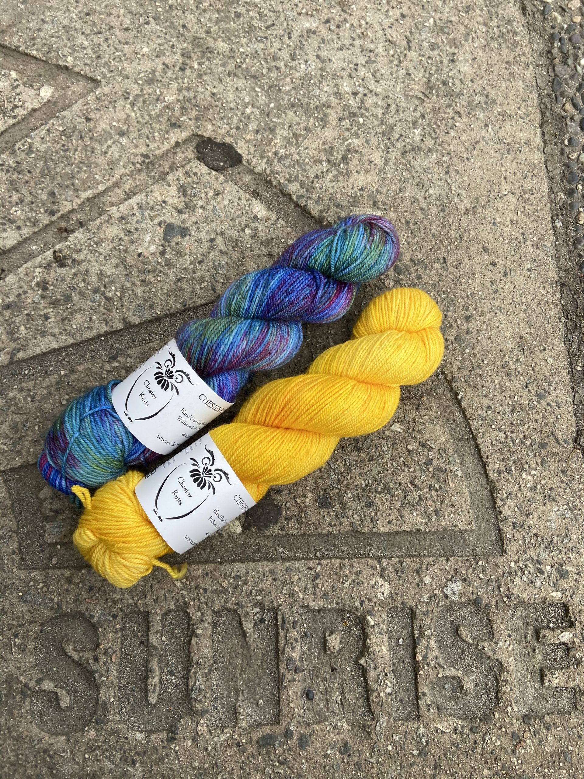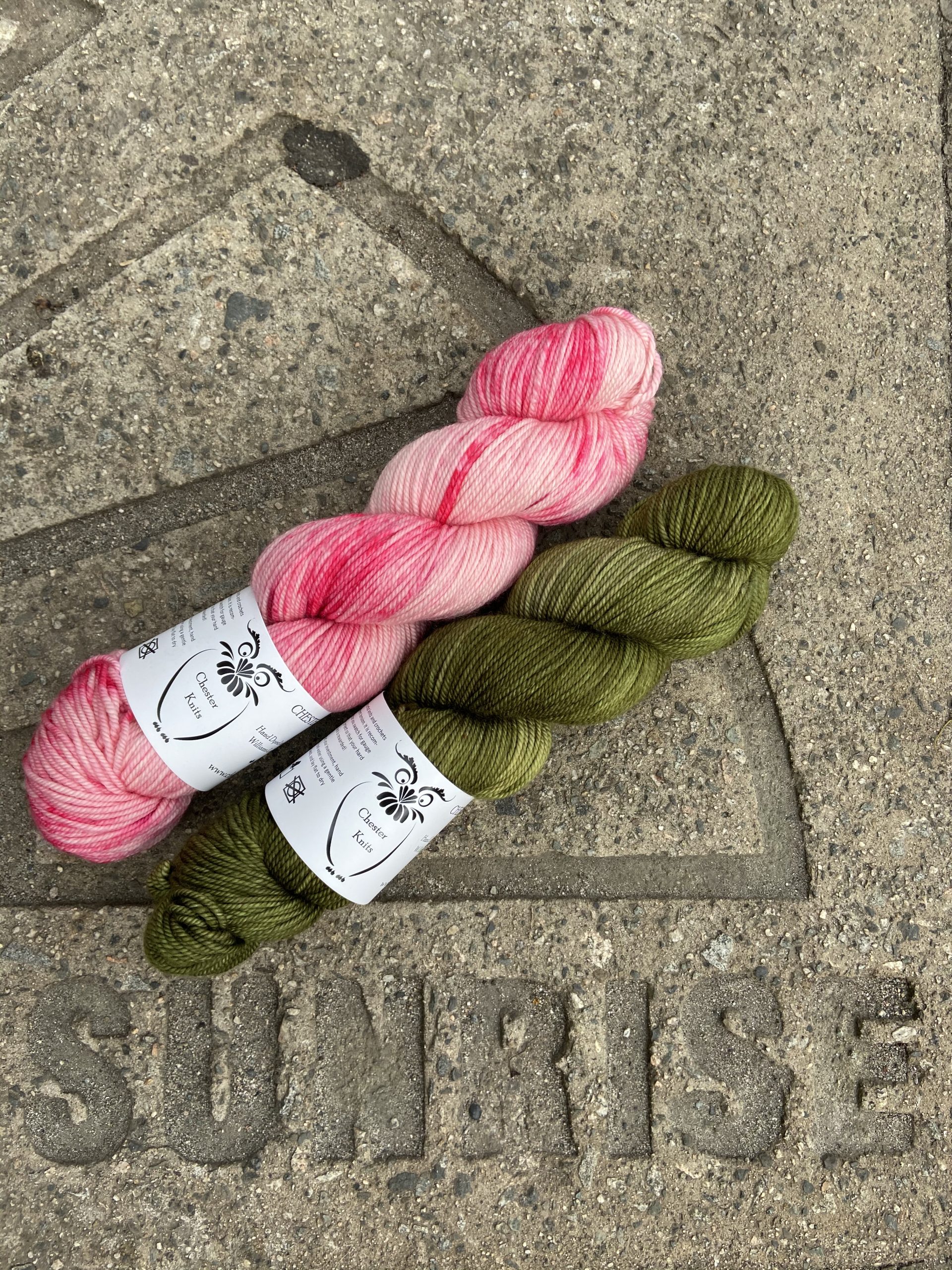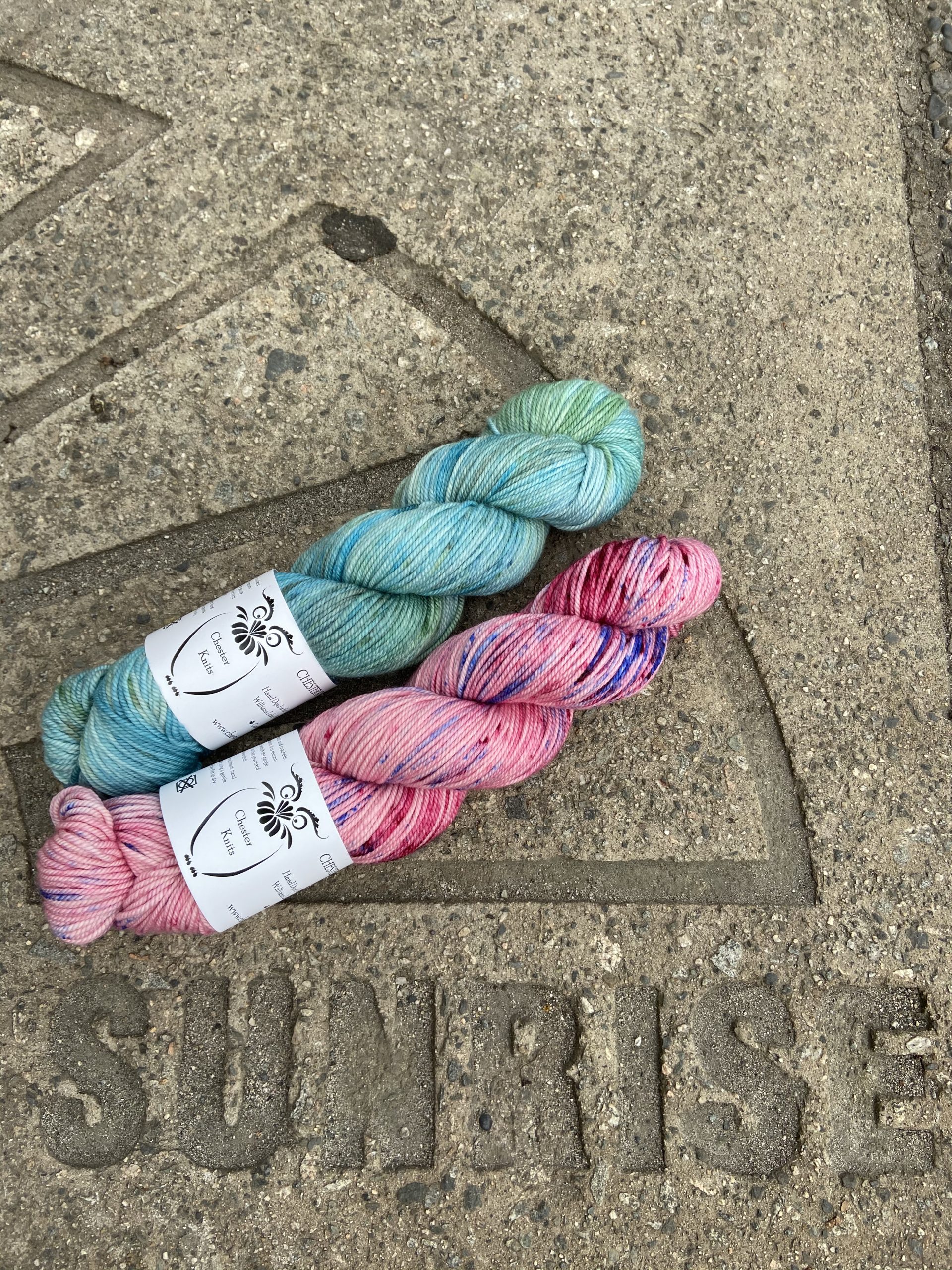 For our kits we have chosen one of our newest lines of yarn for 2020, Chester Knits Soft Sport because as soon as they arrived almost all of our staff ‘sampled’ and fell in love with this base. Using a sport-weight instead of the pattern’s fingering recommendation, the yardage needed is two skeins of each colour and your shawl will end up slightly larger than the pattern’s given dimension. You’ll also want to purchase Casapinka’s Breathe and Hope shawl that’s available here. The colour combos above are: