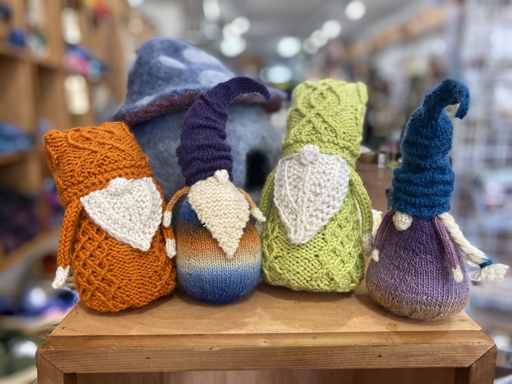 Macrame plant holder, knit gnomes, felted succulents and animals, and the alpine macraweave kits that are featured in the front of the store.