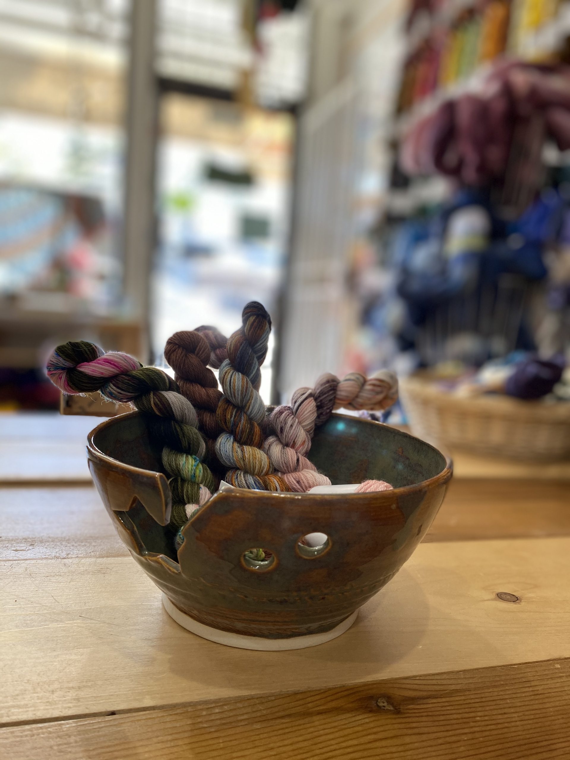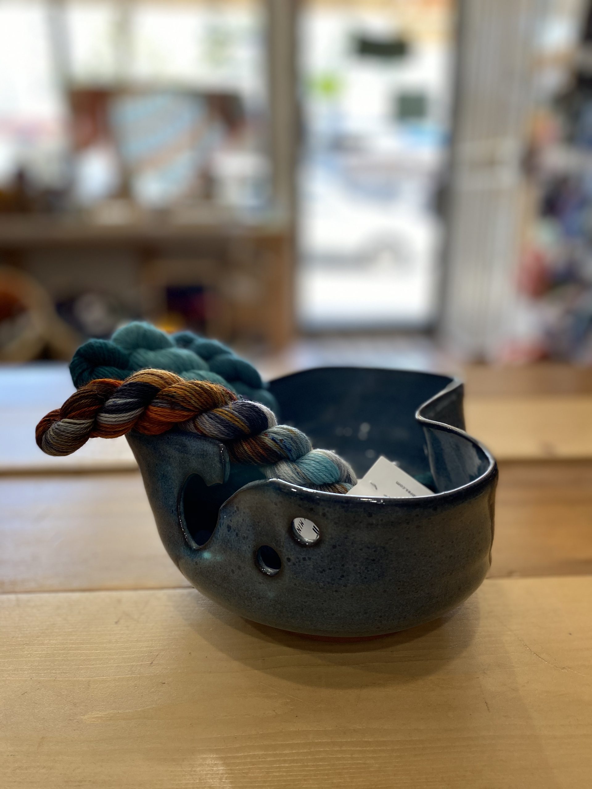 Our yarn bowls from Lavender Lampworks might be as gorgeous as what’s on your needles and are the ideal way to keep your ball of yarn in check. The Lavender Lampworks yarn bowls are made in the Comox Valley by Judy Gadicke (who is both a lampwork artist and a potter) and come in beautiful greys, blues and brown/green.