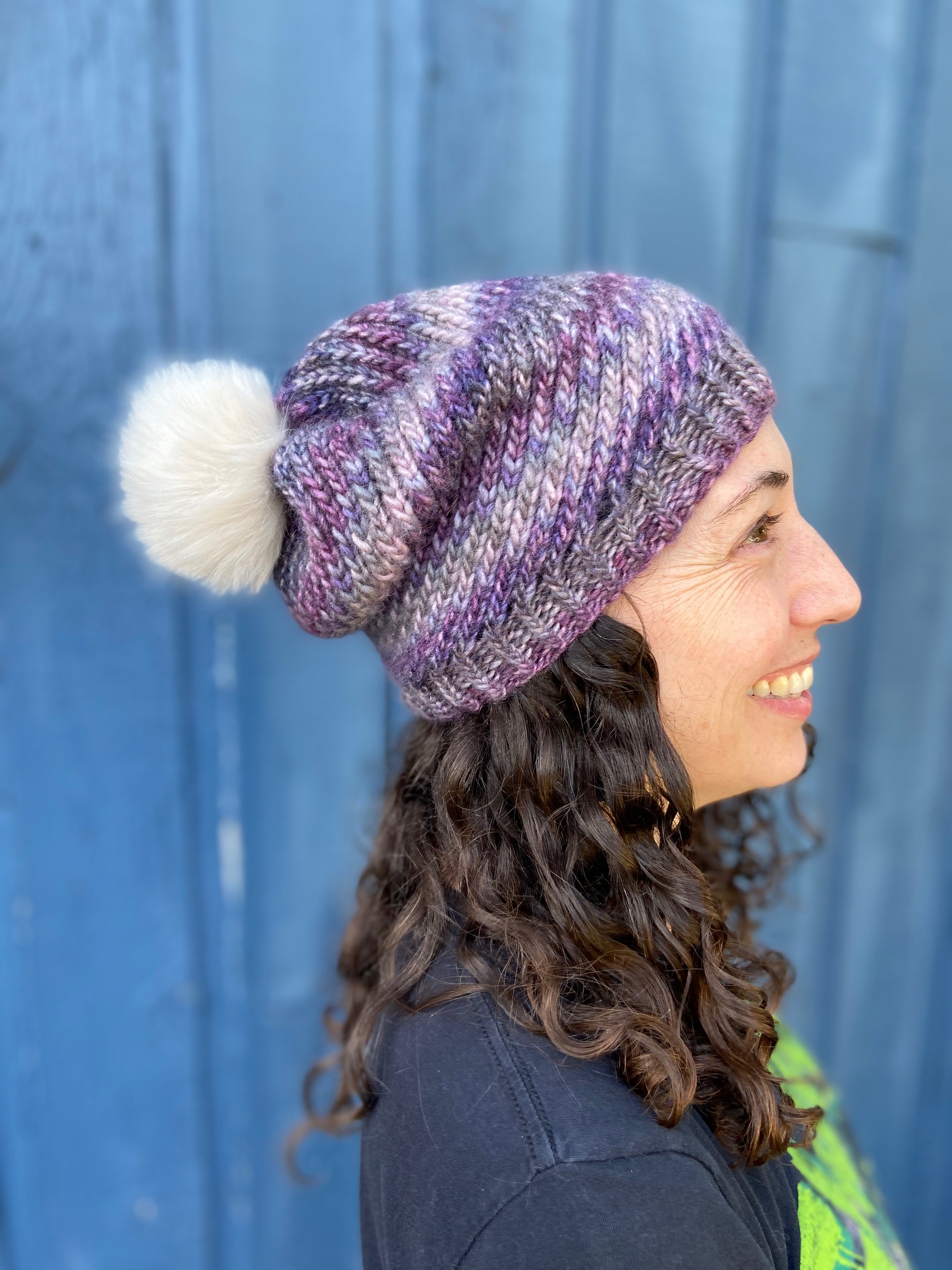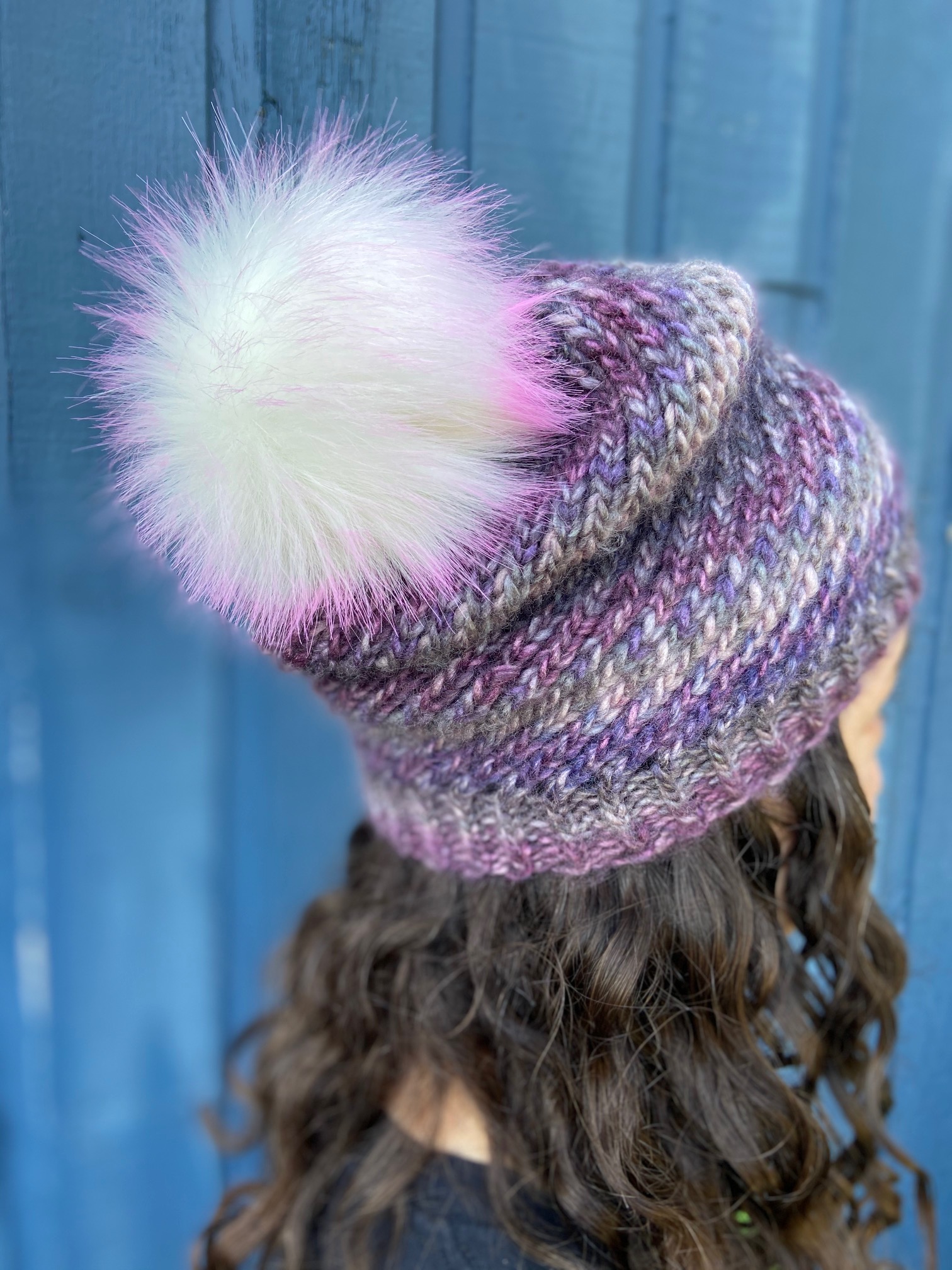 Lara, a friend of the store, models the Flux hat knit in Classic Shades Frenzy (Quarry colourway) with a Yarnboler pom pom.