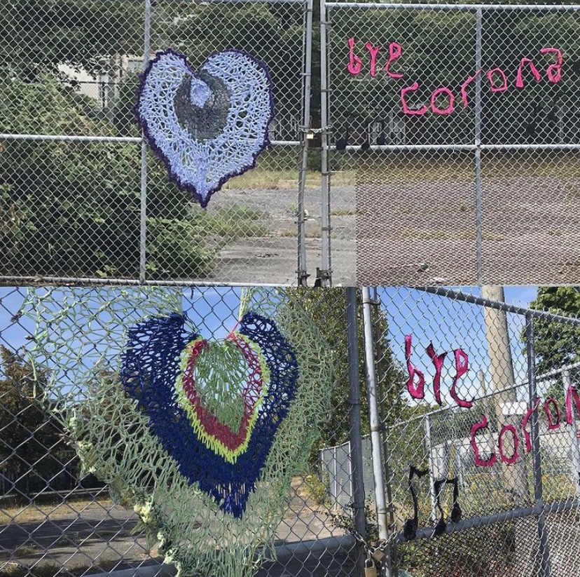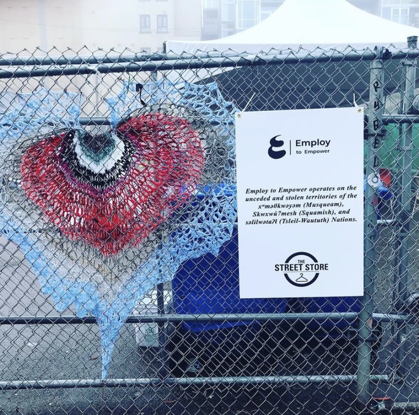 Equally important, she has been added culturally relevant pieces throughout Vancouver highlighting the corona epidemic, ‘can’t breathe’ and various Downtown East Side initiatives. Through our Upcycling initiative, we were able to direct two large bags full of underloved yarns to Dee in the early months of winter to help supply Dee with the raw materials needed to continue on these amazing public art projects. Be sure to follow her efforts via Instagram @deirdrepinnockdesigns.