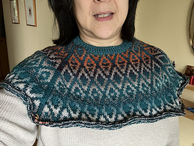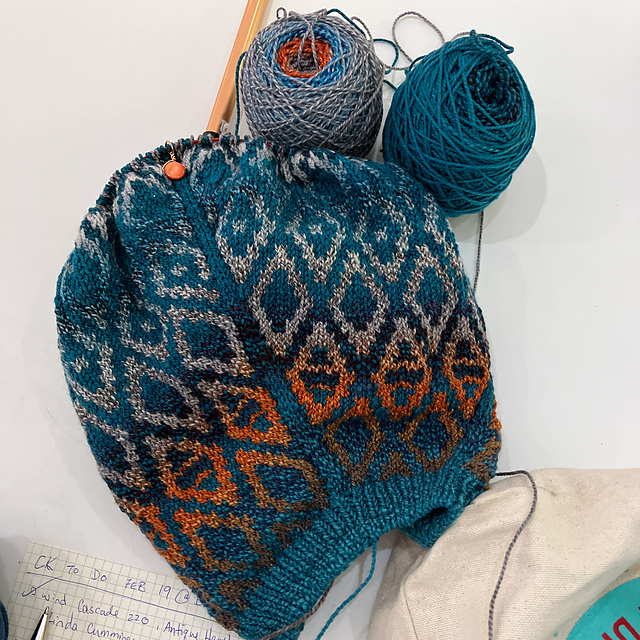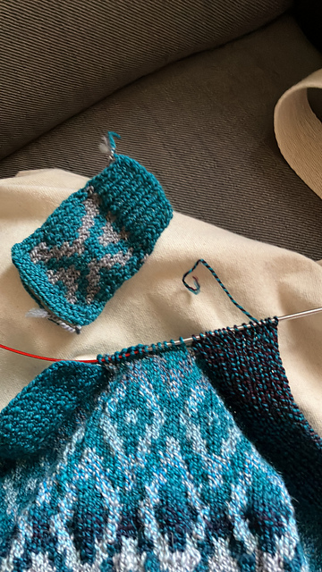 To match the orange accents at the yoke, Cheryl used TKB cords to hold the main body while working on the sleeves. She followed the chart for size 4 sleeves but started at round 7 to match the size 5 body. Instead of picking up stitches from the body & opted to cast on stitches and planned to sew the seams during finishing.