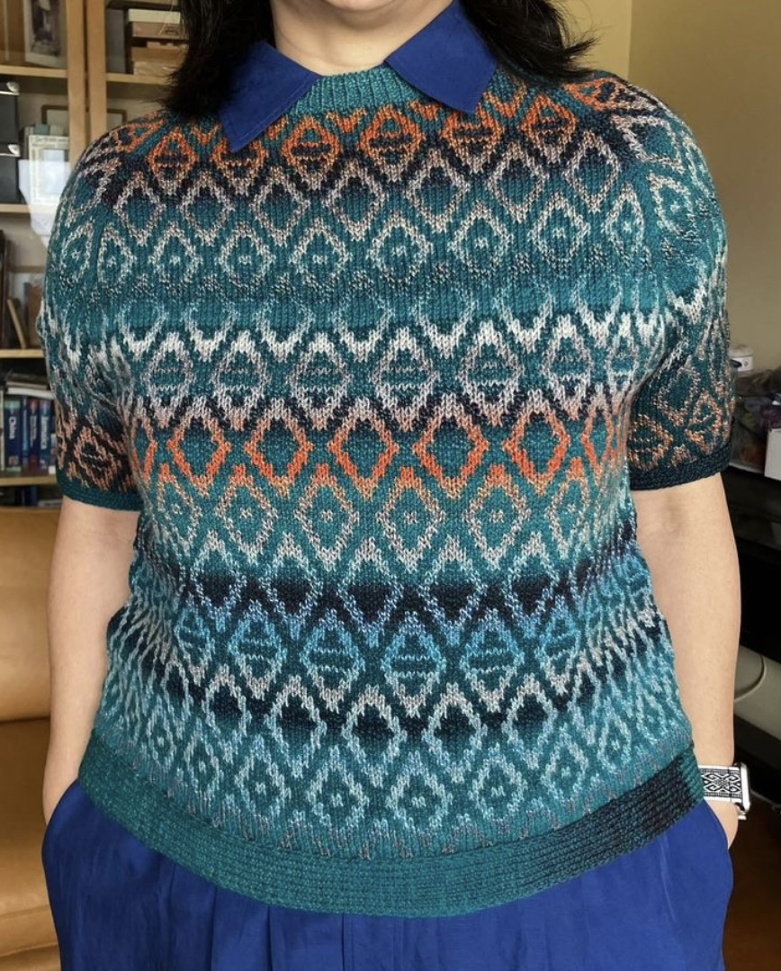 Cheryl just crossed another project off her wish list! She’s completed the Dyemonds Sweater by Josée Paquin using exquisite Spincycle yarn, adding her own twist with modified bottom and sleeve edging.