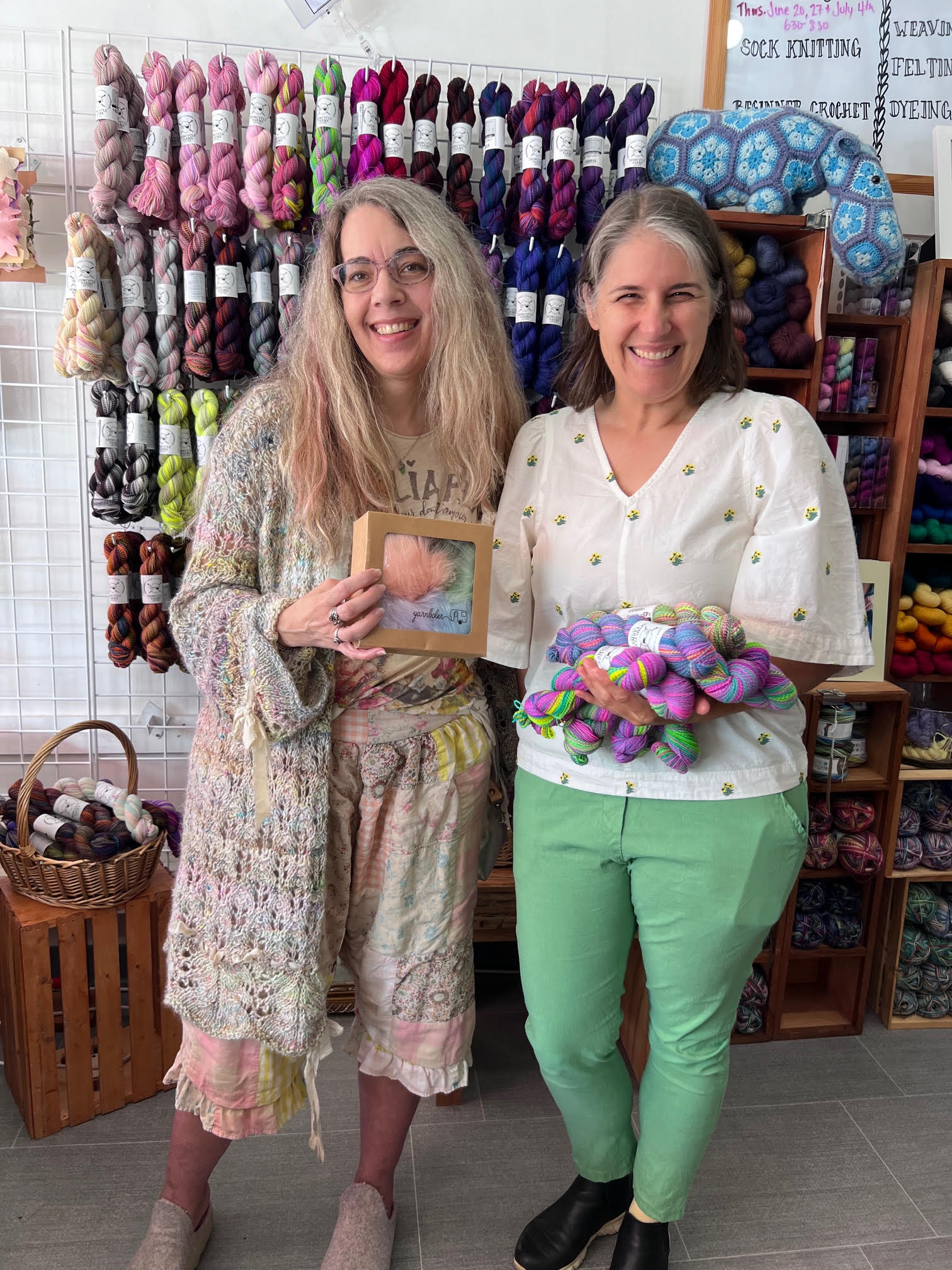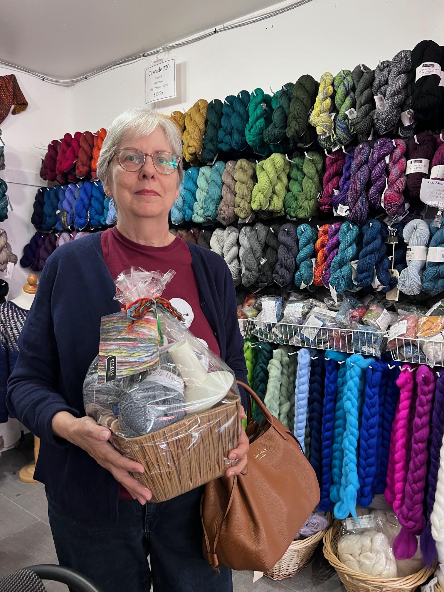 In addition to a $25 gift certificate to our store, we handed out four lovely pom poms from local fav Yarnboler, a skein of yak from Calgary-talents Ancient Arts, and an amazing gift basket from Canadian family owned and operated Estelle Yarns!