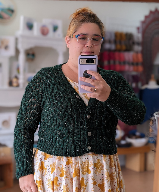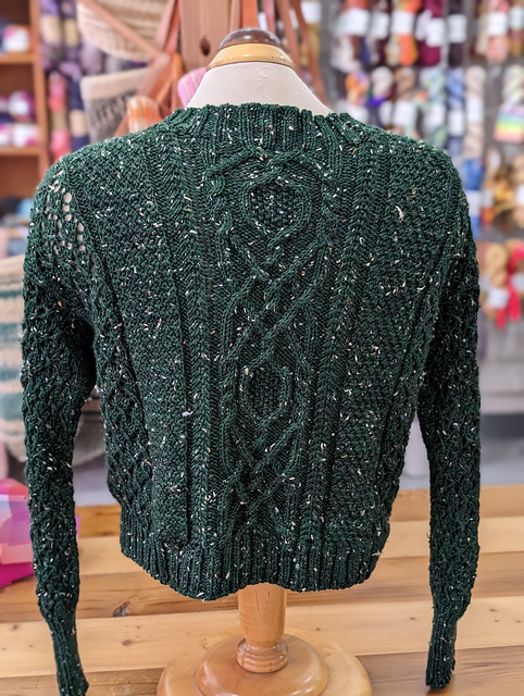 For this project Sarah chose chose Fireweed Tweed in the colorway Black Emerald—a luxurious, hand-dyed yarn from Winnipeg, Manitoba. This yarn is a blend of 85% superwash merino and 15% Donegal neps, resulting in a fabric that’s incredibly soft, squishy, and has outstanding stitch definition. The Donegal neps—small flecks of fiber in neutral colors—add a delightful texture to the yarn, giving your finished cardigan a rustic yet refined appearance. The superwash merino makes this yarn incredibly soft against the skin, making it a pleasure to wear. The high twist of Fireweed Tweed ensures that every stitch pops, showcasing the textured patterns of the Three Seasons Cardigan beautifully.