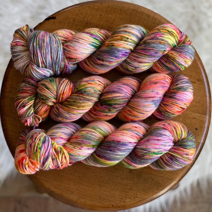 Their Solar Sock base is a workhorse with a touch of magic: an 80/20 Superwash Merino/Nylon, two-ply fingering weight yarn with strength, softness, and beautiful stitch definition. It’s ideal for socks that will stand up to everyday wear, but just as at home in shawls, lightweight sweaters, or anything that calls for durability without sacrificing drape.