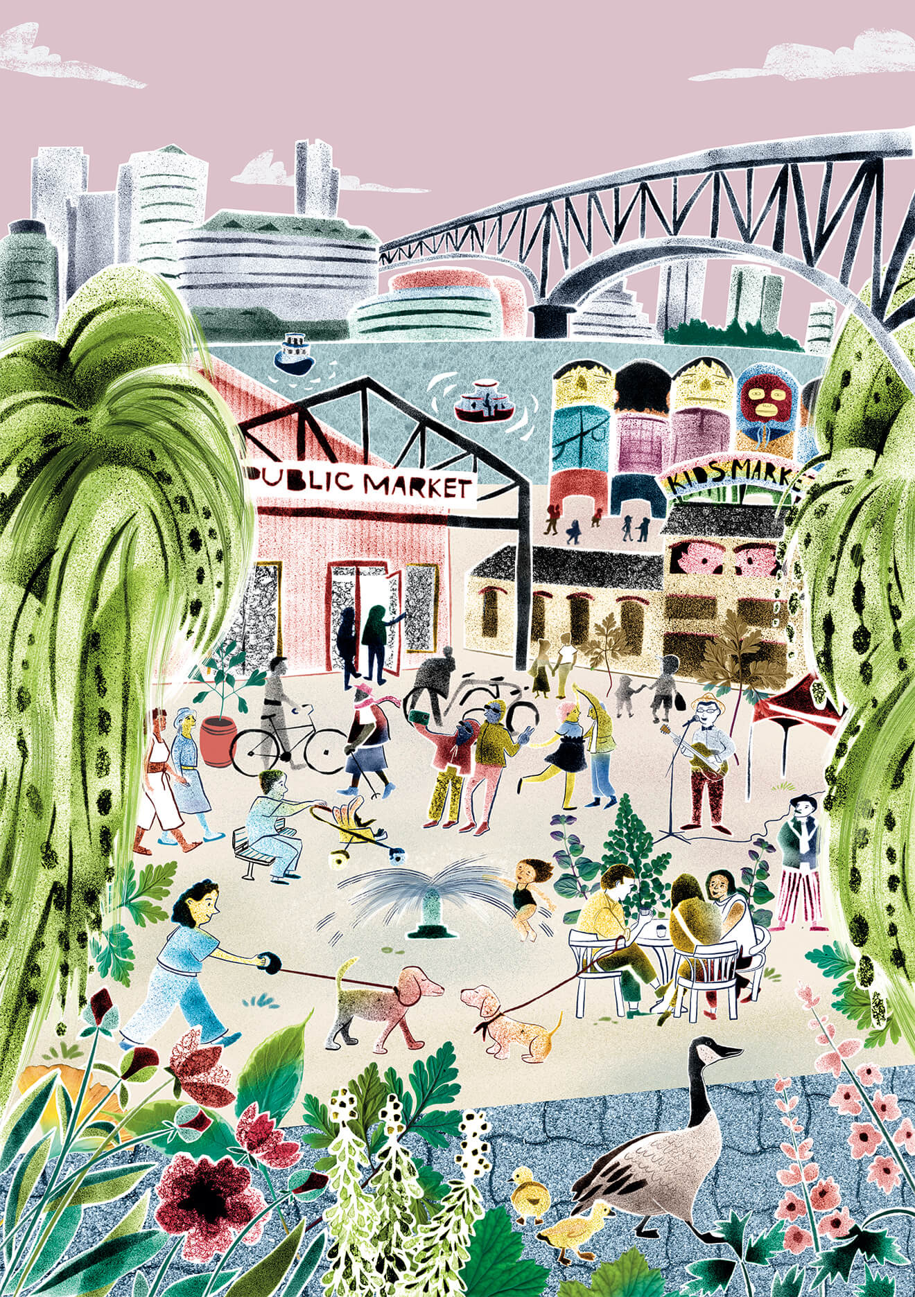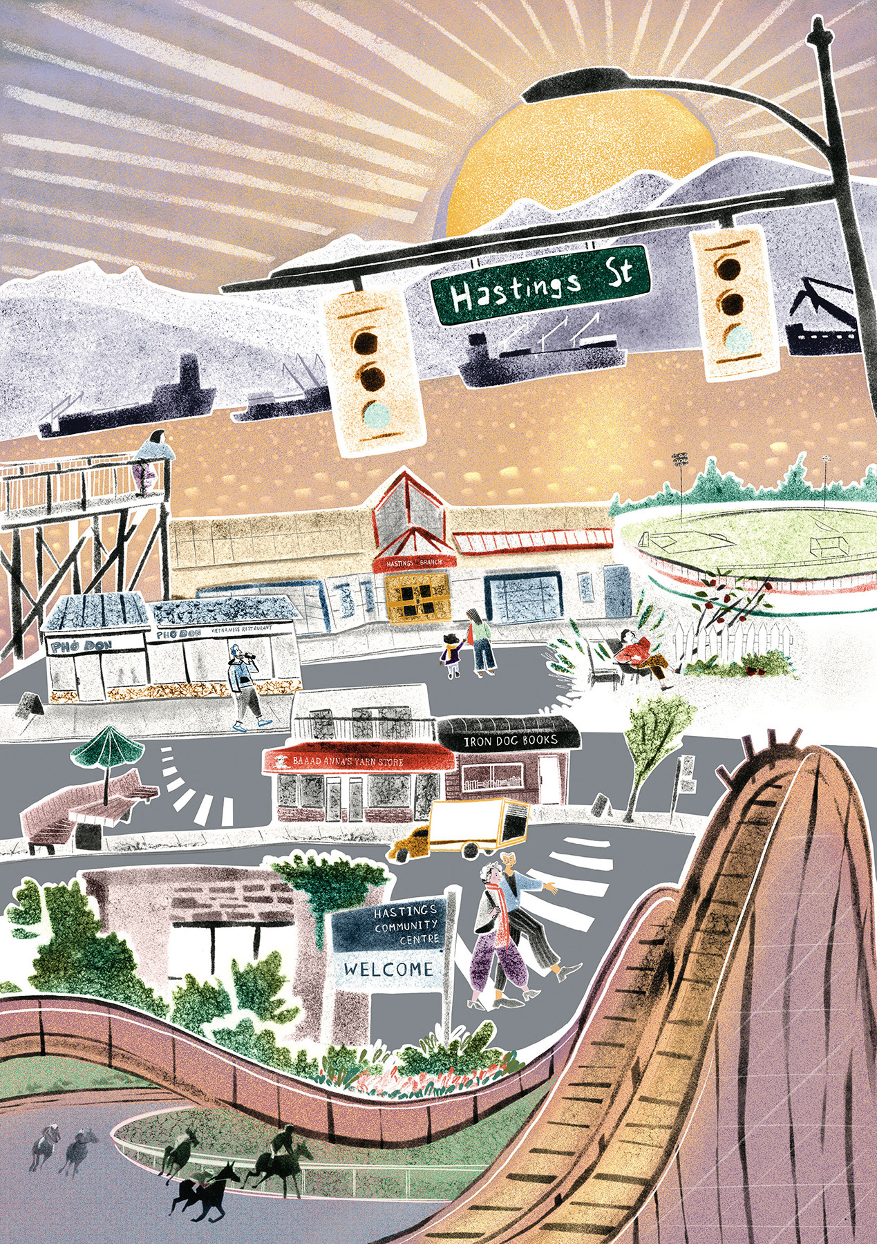 They started with me taking a walk in the neighbourhood and trying to capture its feeling. I tried to pay attention not just to what I saw, but also to what I heard, smelled, and touched, and those things influenced the colours, textures, and little elements you could spot in the posters. And I’m especially interested in the narrative aspect of illustration, so perhaps that’s why the posters feel a bit story-like. I based some of the characters on actual people and scenes I spotted on my walks.